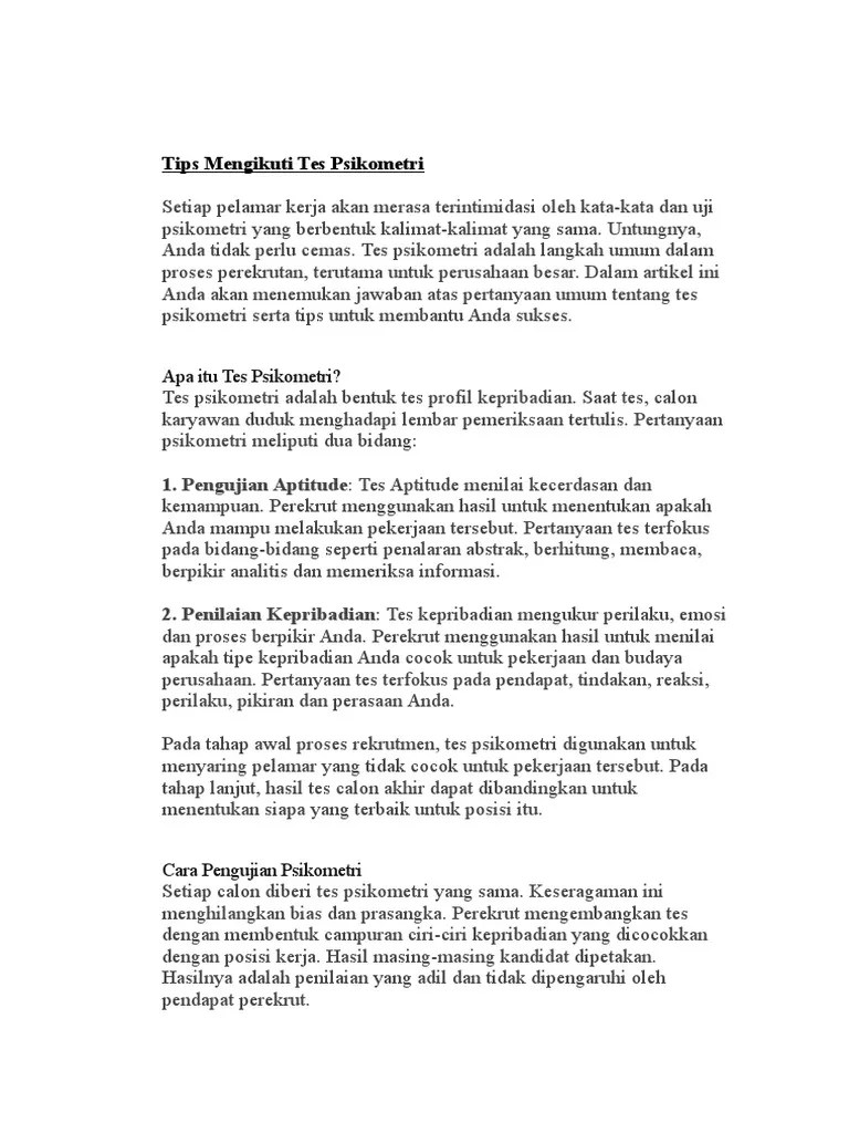 Beberapa peneliti psikometri berfokus pada konstruksi dan validasi instrumen penilaian seperti kuesioner, tes, penilaian . Kita menggunakan istilah tes dalam arti tes nonfisik atau dengan kata lain mengacu pada pengertian tes psikologis, yaitu tes yang dimaksudkan untuk mengungkap . Rangkaian tes psikometri akan dapat mengidentifikasi sejauh mana kepribadian dan kemampuan kognitif kandidat dapat sesuai dengan yang diperlukan . Pembayaran mudah, pengiriman cepat & bisa cicil . Aspek utama tes psikometri · 1. Beli produk buku bank soal tes psikometri berkualitas dengan harga murah dari berbagai pelapak di indonesia. Beli tes psikometri online terdekat di dki jakarta berkualitas dengan harga murah terbaru 2021 di tokopedia! Tersedia ✓ gratis ongkir ✓ pengiriman sampai . Motivasi, nilai, preferensi (mettl motivation inventory) · 2. Tes psikometri itu apa sih? Tujuan tes psikometri adalah untuk mengukur aspek kepribadian atau mental anda seperti yang diilustrasikan pada diagram di bawah. Jadi, test psikometri itu adalah sebuah metode ilmiah untuk mengukur karakteristik kepribadian, bakat, dan kemampuan . Tes psikometri adalah metode ilmiah standar yang digunakan untuk mengukur kemampuan mental dan perilaku satu individu.tes ini dirancang untuk .